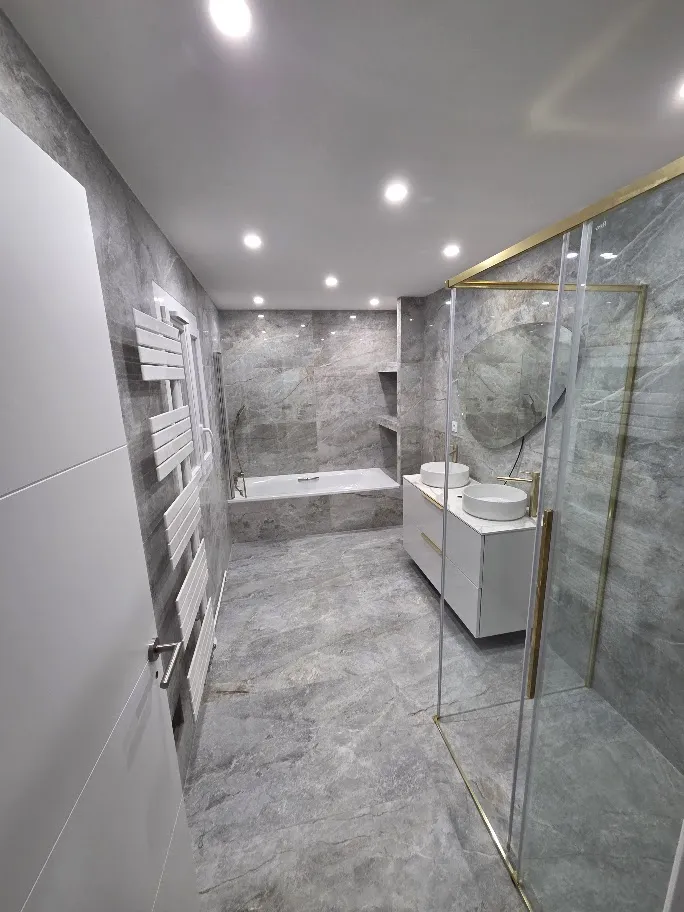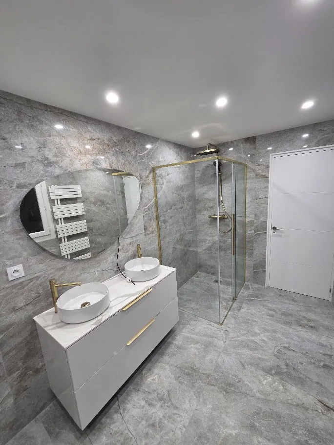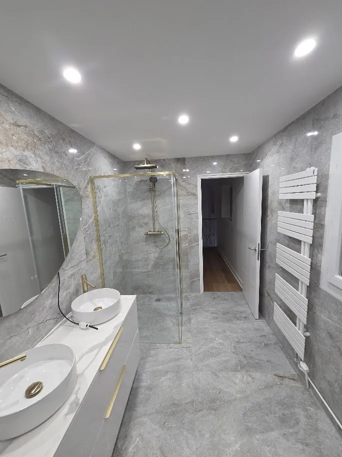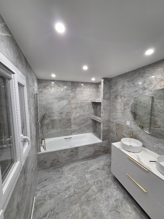 La salle de bain a été entièrement rénovée : pose de carrelage grand format, création d’une baignoire intégrée, installation d’un meuble double vasque et mise en place d’un éclairage encastré pour un rendu moderne et élégant.