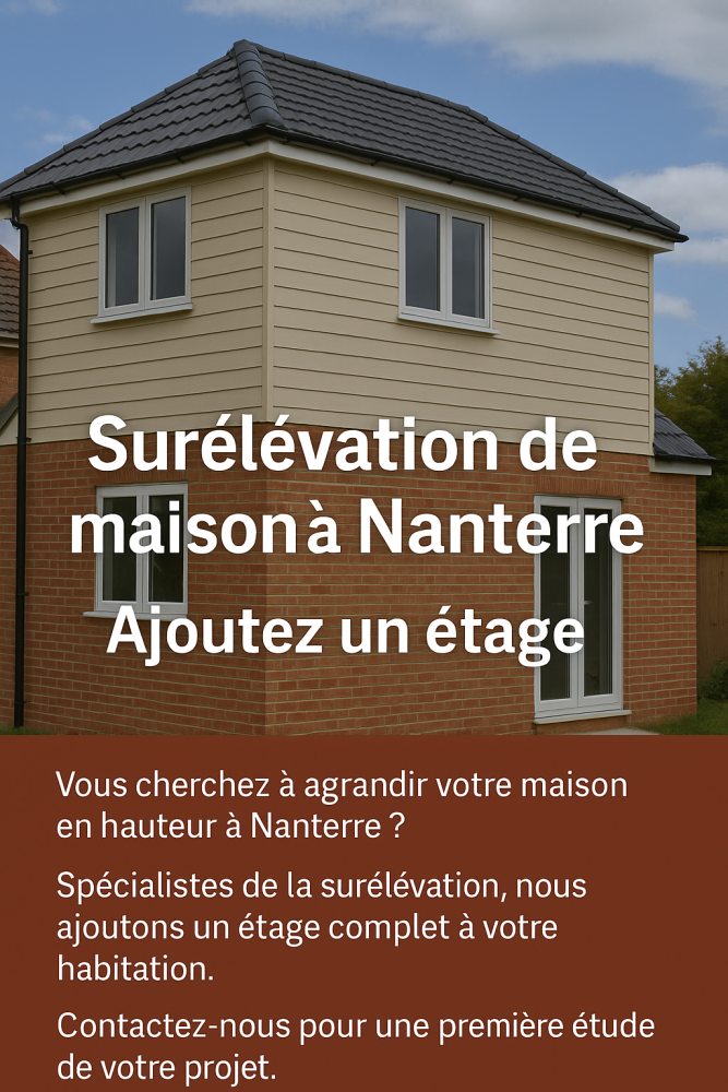 Vous souhaitez agrandir votre habitation sans empiéter sur votre terrain ? La surélévation de maison à Nanterre (92) est la solution idéale pour créer un étage supplémentaire et augmenter votre surface habitable. MAV Construction, spécialiste de la rénovation et de l’extension en Île-de-France, vous accompagne dans toutes les étapes de votre projet : étude de faisabilité, démarches administratives, renforcement de la structure, création de l’étage, isolation, charpente, toiture et aménagement intérieur.