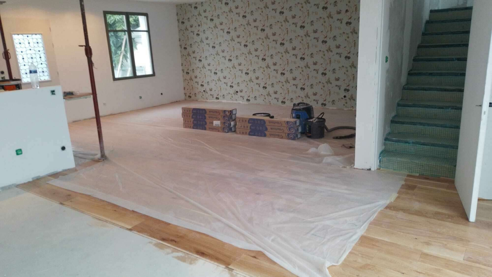 Pose d’un nouveau parquet en chêne clair dans le séjour.
