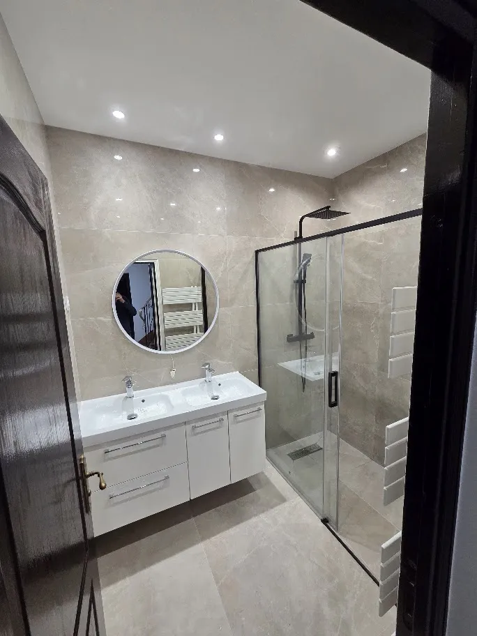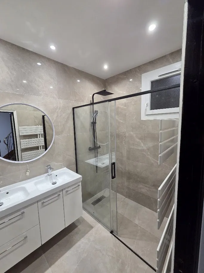 Les travaux comprennent la pose de carrelage grand format, l’installation d’une baignoire encastrée, d’un meuble vasque contemporain et d’un éclairage intégré, garantissant un rendu moderne et harmonieux.